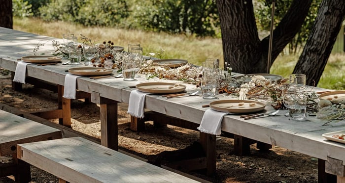 For casual, family-style outdoor entertaining, embrace the art of shared dining. Large serving platters, timber boards, and woven trays make it easy for guests to help themselves, while adding a relaxed elegance to the table. Choose serving ware with bamboo, rattan, or marble handles for a refined yet durable finish. For a charming, rustic touch, gather cutlery in mason jars or vintage flowerpots and place them along the table for easy access.
