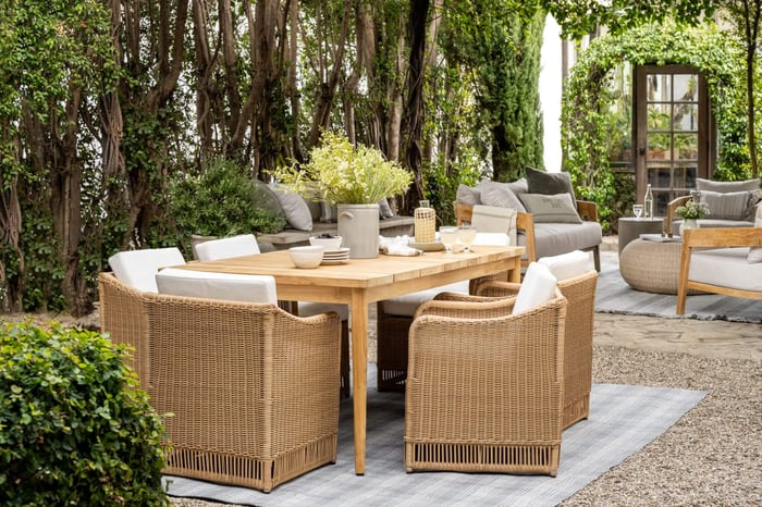 - For permanent outdoor lounging & dining areas, look to teak, wrought iron or synthetic rattan furniture.