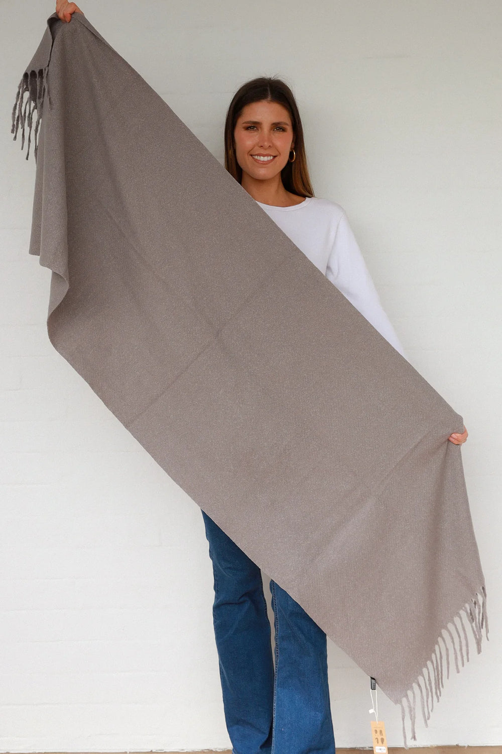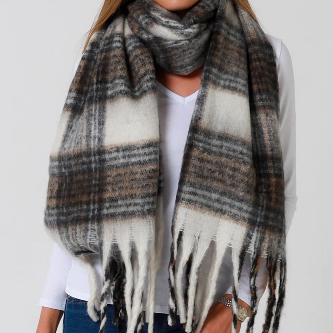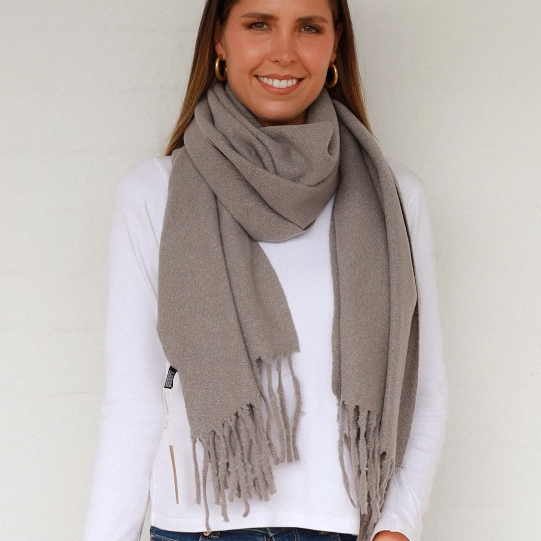 Style a neutral-toned scarf as a versatile accessory for both casual and evening looks.
