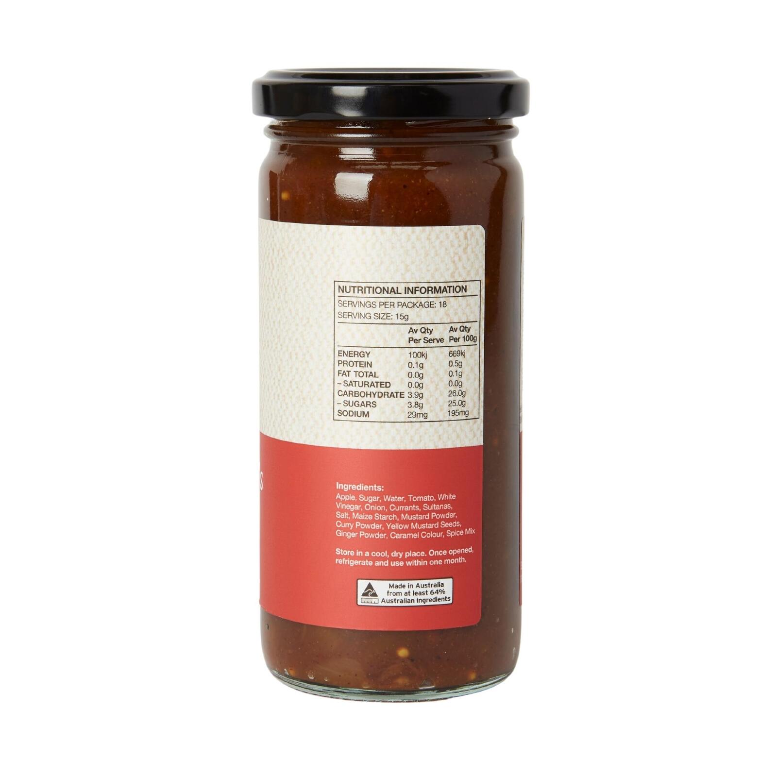 Apple, sugar, water, tomato, white vinegar, onion, sultanas, modified starch (E1412), currants, salt, spice infusion, unmodified starch, caramel colour (E150c), mustard flour, curry, yellow mustard seed, ginger (spice), black pepper, clove leaf oil (rectified), cinnamon flavour oil.