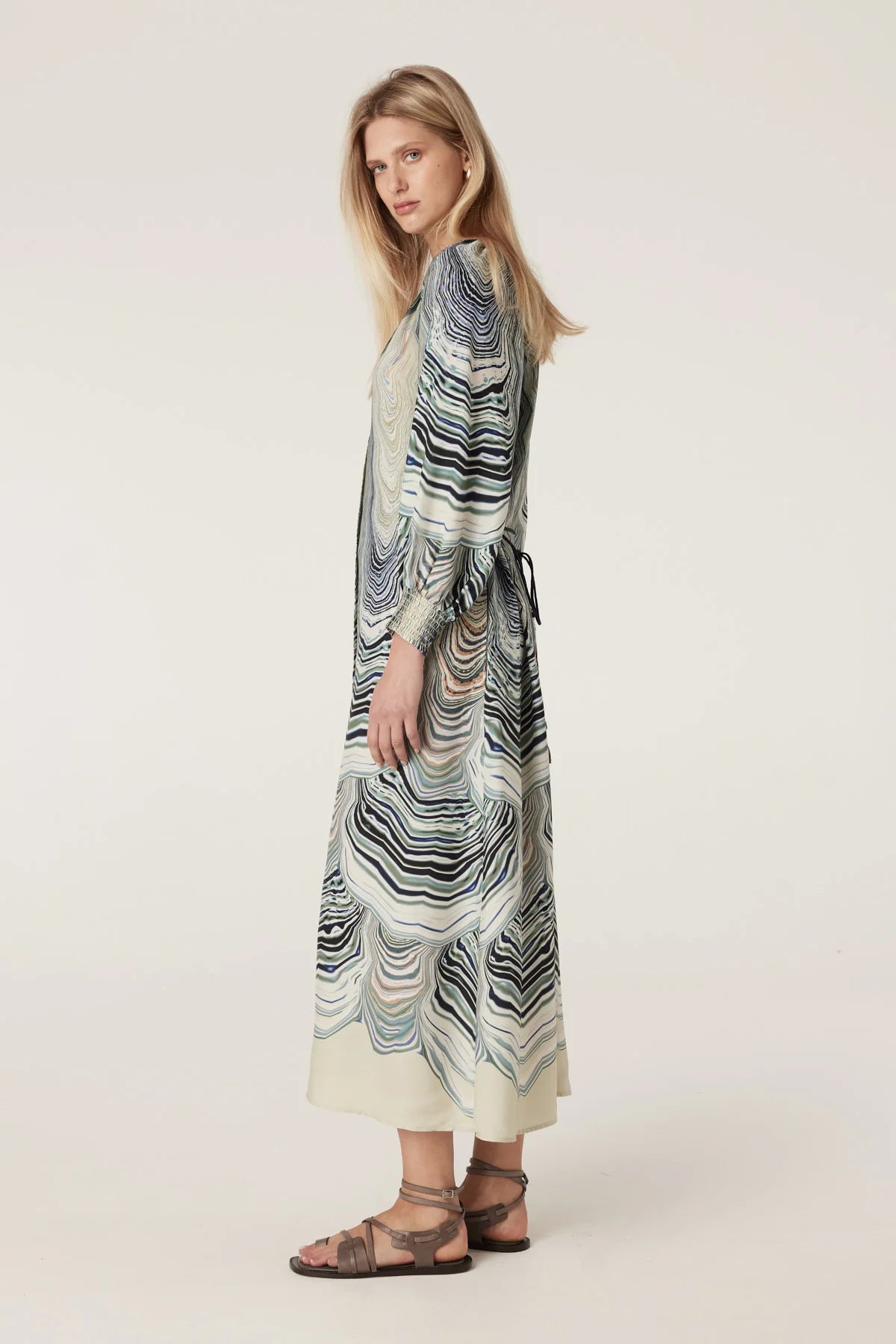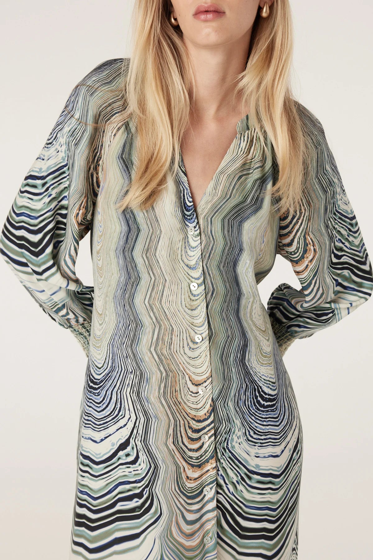 Relaxed fit • Lightweight silk blend • Exclusive shell print with waist tie