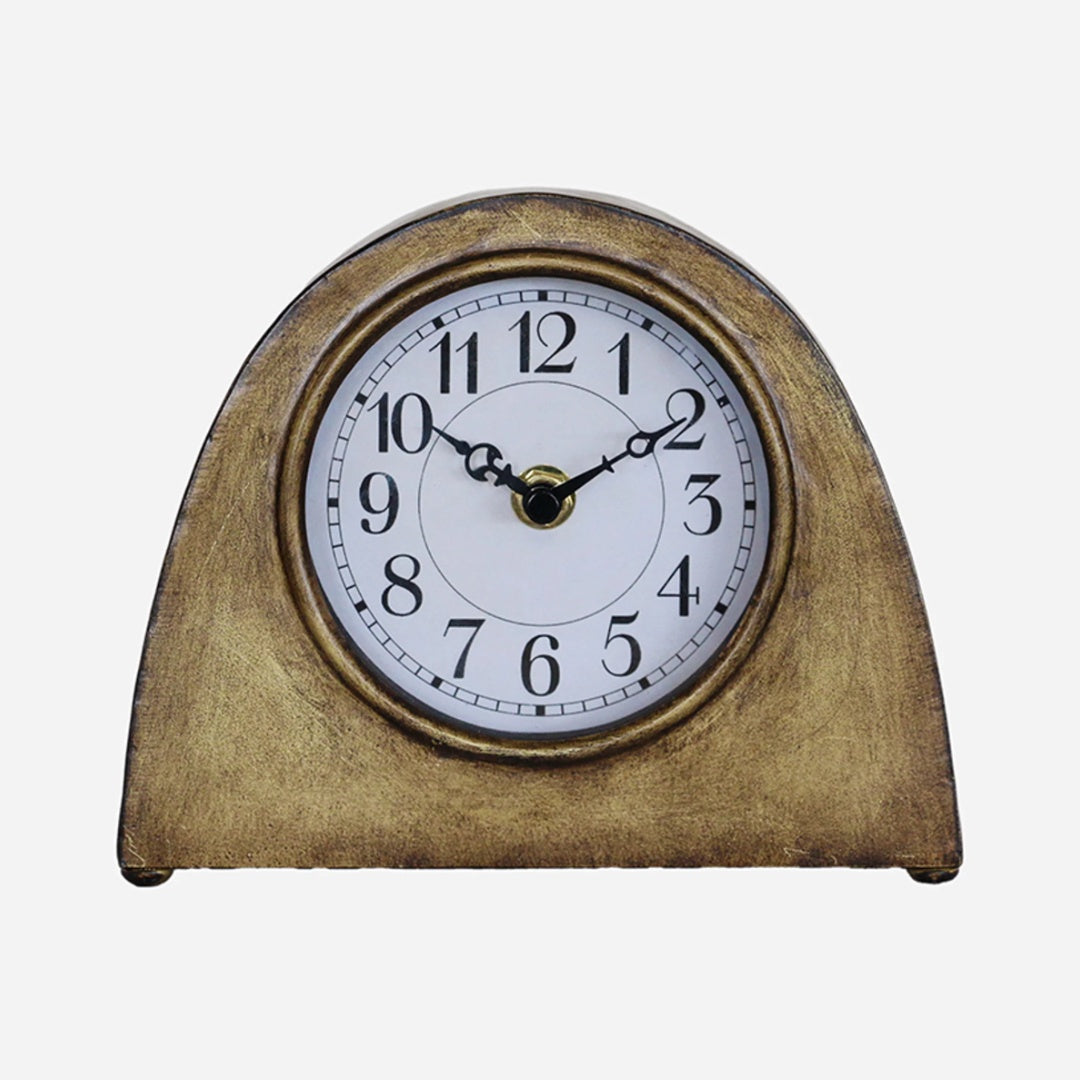 Crafted from iron with an antique brass finish, this clock introduces warmth and a subtle sense of heritage, making it ideal for styling on a mantelpiece, console, bedside, or shelf. Its compact size allows it to sit effortlessly within layered vignettes, adding both function and a touch of old-world charm.