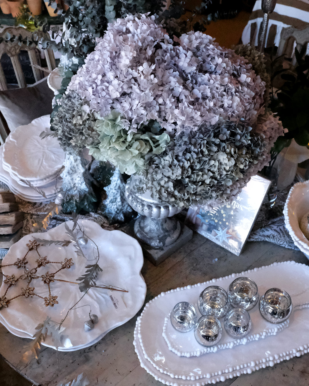 Think eucalyptus branches, muted hydrangeas, cool metallics, sculptural ceramics, and a gentle interplay of light and shadow. Perfect for those who love a serene, organic, and understated holiday aesthetic, this collection brings the fresh, tranquil spirit of the Nordic landscape into your home.