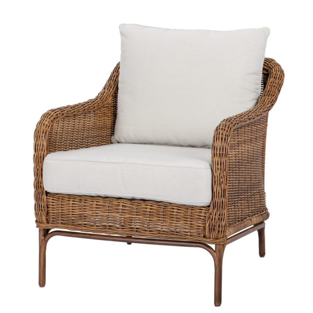 Use woven chairs with linen cushions to create a relaxed, coastal retreat.