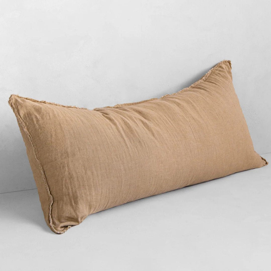 Our versatile Flocca Linen Body Pillow is an elegant combination of luxury and practicality that will bring comfort and style to your bedroom or living space. Our extra-long linen body pillow case is finished with a double stitch hem, beautiful hand 'tufted' edges, and secured with a hidden closure, making it a luxurious body cushion for both living and bedroom. The Flocca Linen Body Pillow in Carmel is a sun-bleached caramel tone.