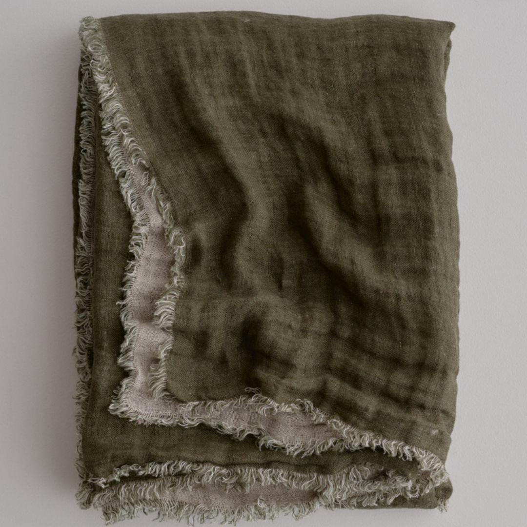 The Crush Double Throw in Armee/Sable features a lush deep khaki hue on one side and light natural sandy colour on the other side.