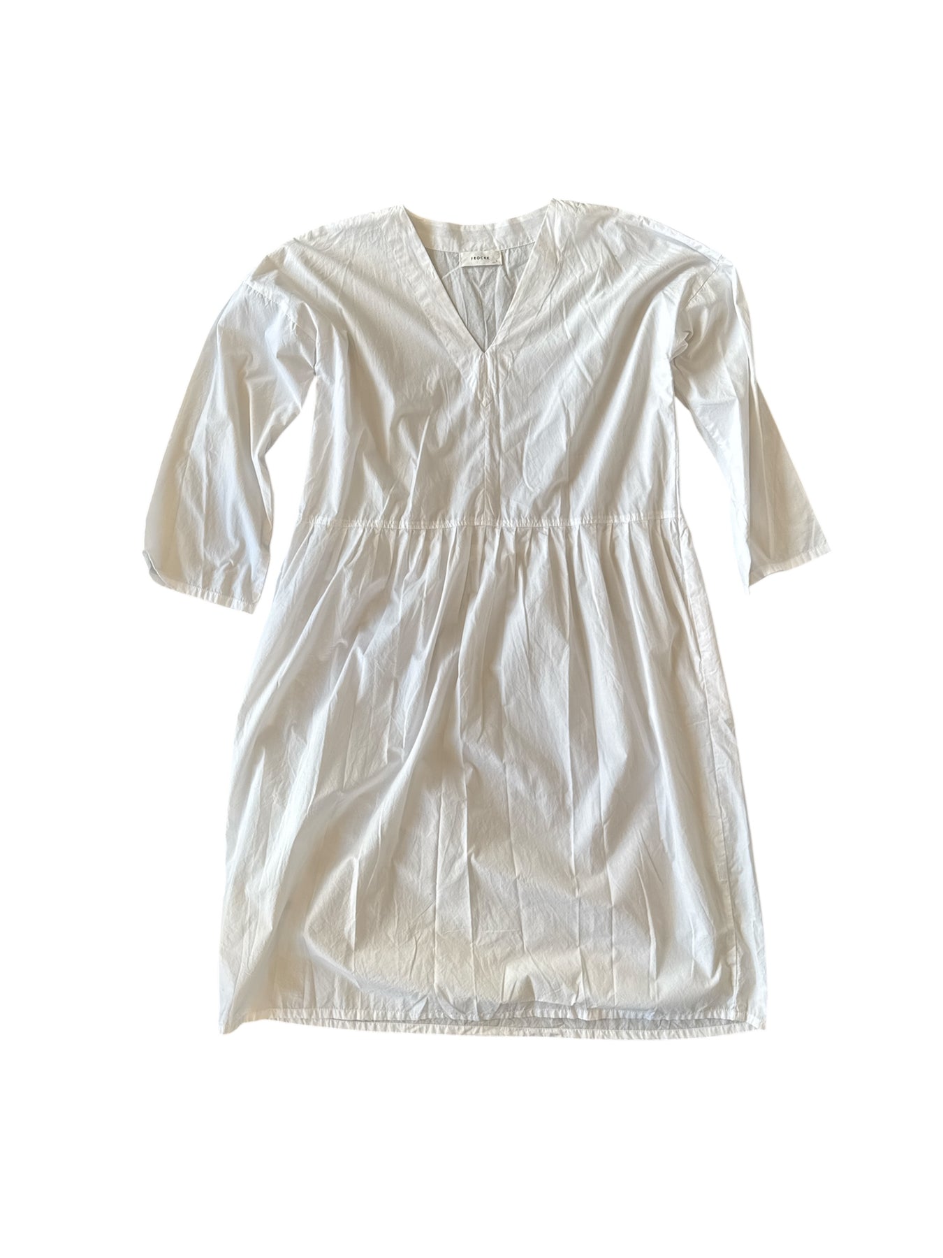 The Paige Dress in White by Frockk embodies effortless elegance and everyday comfort. Crafted from soft, lightweight cotton, this timeless piece features a flattering deep V-neckline, long sleeves, and a softly gathered waist that creates a relaxed yet feminine silhouette.