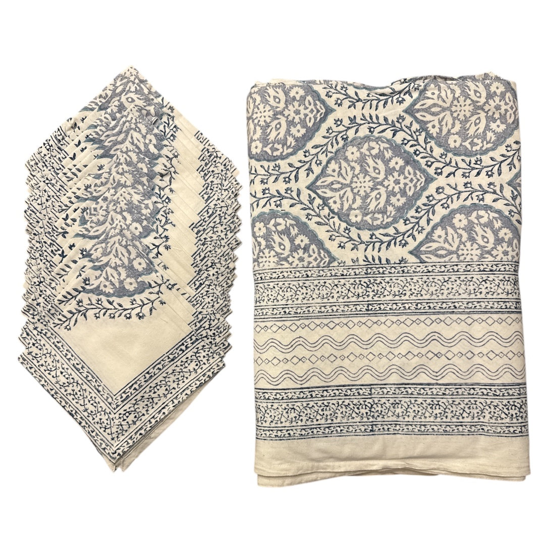 Large Jaipur Cotton Tablecloth 4.5m x 2.30 m & 16 x Napkin Set | Blue/Grey/White