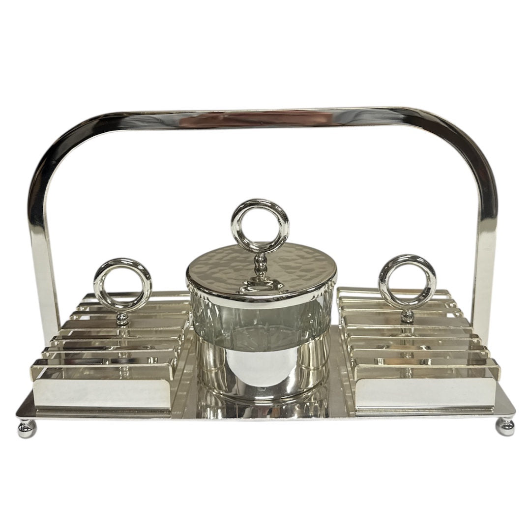 Elevate your tea ritual with this beautifully handcrafted Turkish Tea Service, featuring a polished silver finish and elegant ring-handled detailing. The set includes two slotted sections for organising tea sachets or sweeteners, along with a central glass jar topped with a hammered-effect silver lid—perfect for storing loose tea, sugar, or small treats.