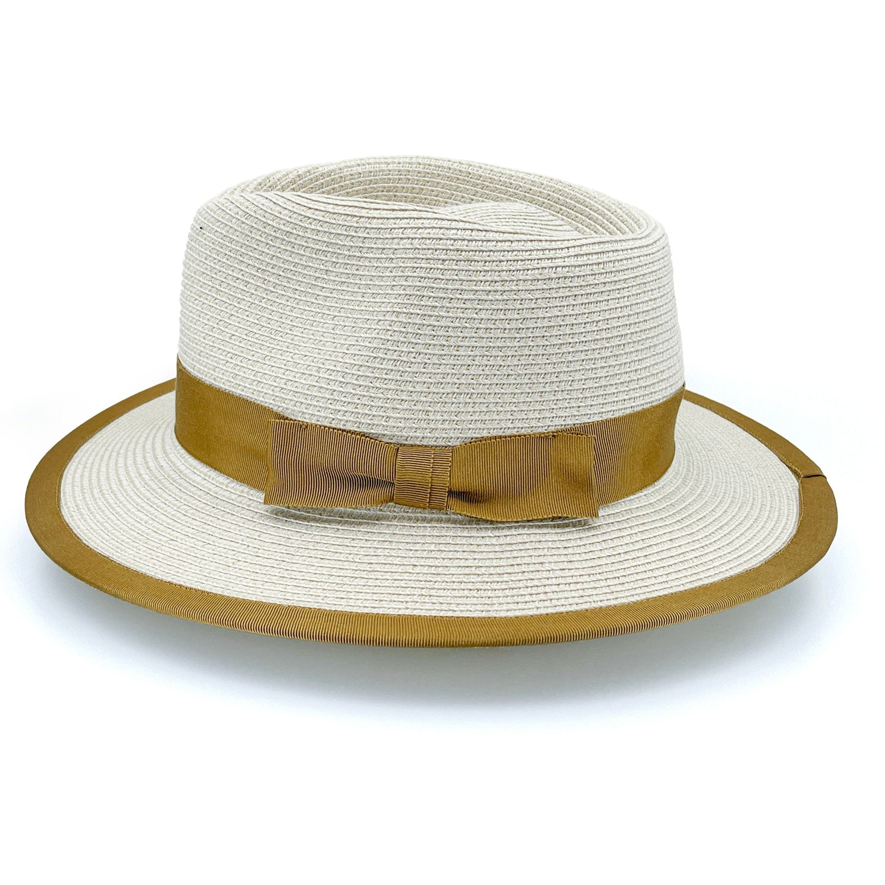 Glamour meets modern design in the Boston Fedora. Presented in a soft ivory tone, this refined style is elevated with a distinctive gold ribbon trim that traces the crown and edge of the brim, creating a look that blends old-world elegance with a contemporary, fashion-forward finish.