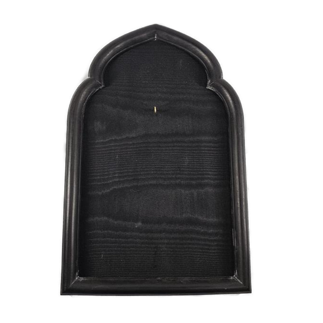 Bring a touch of dark romanticism to your décor with the Canterbury Hanging Frame. Finished in deep gothic black, this arched frame features a luxurious moiré taffeta backing and a small brass hook designed for displaying treasured mementos—whether a vintage locket, old photograph, or a single dried rose.