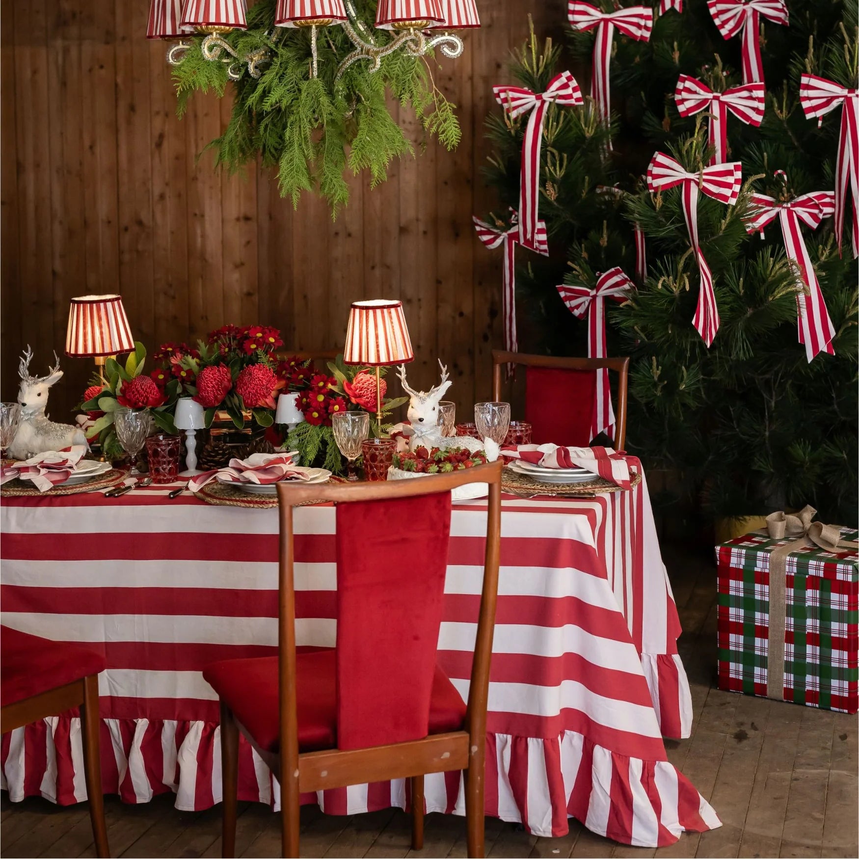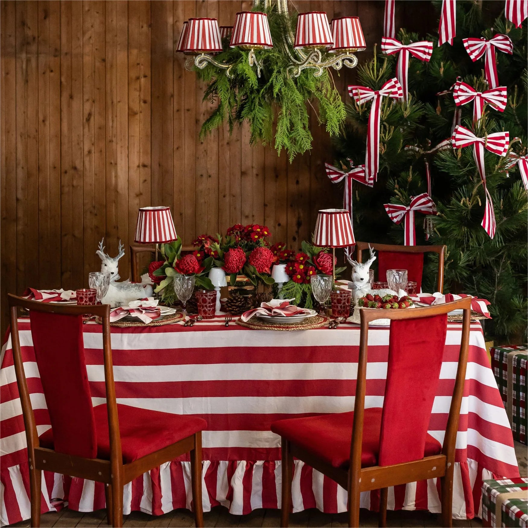 Add a cheerful and festive touch to your holiday table with the Rouge Ruffle Stripe Table Cloth. Crafted from 100% pure cotton, this beautifully designed tablecloth features a vibrant rouge stripe complemented by an elegant ruffled edge, creating a warm and inviting backdrop for Christmas celebrations. Its generous 180 x 360cm size ensures a graceful drape, perfect for larger dining tables and seasonal gatherings.